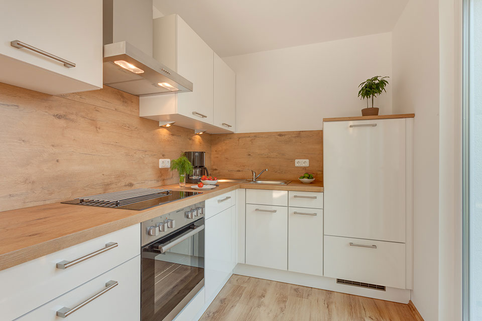 Küche mit Spülmaschine, Backofen, Kühlschrank,